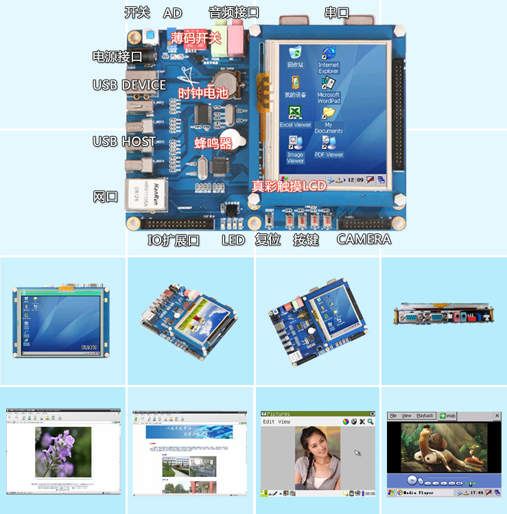 - LCD和觸摸屏接口支持3.5寸、4.3寸、5.6寸、5.7寸、7寸、8寸等TFT液晶屏