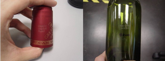 葡萄酒行業(yè)由于產(chǎn)品自身的特點,一方面生產(chǎn)速度快,另一方面,產(chǎn)品入箱順序難以保證,針對該行業(yè)的特點,易溯科技開發(fā)出一套專門針對葡萄酒行業(yè)的防竄貨管理解決方案。  可以在酒瓶的瓶身上或者瓶徑處利用激光機標刻防竄貨產(chǎn)品ID,如下圖所示。